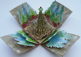 It didn't quite turn out as planned as I couldn't decide what to put in the middle as it needs to have an all round view if you get my drift! I'd already decided on the fir trees and the little houses, but the very centre was tricky! In the end I made a little gold Christmas tree by fringing some gold painted card and sticking it to a tiny cone.